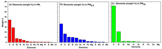 Figure 8 gives a summary of the weight-wise percentage of elements. The total amount of atoms related to the corresponding fraction of PM was computed and then the percentage of weight of each atom in the fraction of PM was calculated. According to EDX spectroscopy, fourteen elements were noted in the samples of the PM1 fraction, which were O, C, Al, Si, Mg, Na, K, Ca, Fe, N, Mo, B, S and Cl. In PM2.5, the recorded elements were O, C, Si, B, Ca, Al, N, Fe, Mg, S, Na, K and Mo, whereas in the samples of PM10, we noted C, O, Si, Na, Cl, Al, K, Fe, Ca and Mg. Our analysis indicates that C and O are greater in percentage. The finding of potassium (K), sulfur (S) and carbon (C) in the atmosphere was due to biomass burning, diesel generators, vehicular emissions, waste incineration, wood burning or agricultural burning in household activities and brick kiln activities in the surrounding areas [72,92,93]. The detection of other elements such as oxygen (O), iron (Fe), silicon (Si), magnesium (Mg), calcium (Ca) and sodium (Na) was due to clay minerals caused by dust re-suspension (wind blowing, vehicular trafficking and building construction) [55,94]. Previous scientific studies confirm that silicon (Si) is the most important constituent of soil minerals [95]. Our study recorded the element nitrogen (N) in the atmosphere of Mingora city. The major source of nitrogen was the waste dumps, decomposition of animal and plants and the use of nitrogen rich fertilizer for crops. Moreover, boron (B) was also detected in our investigations. Cutting and mining in the mountains in the surrounding area contributed boron to the environment. The presence of boron in the urban environment was due to the volatilization of boron during the process of coal combustion [96].