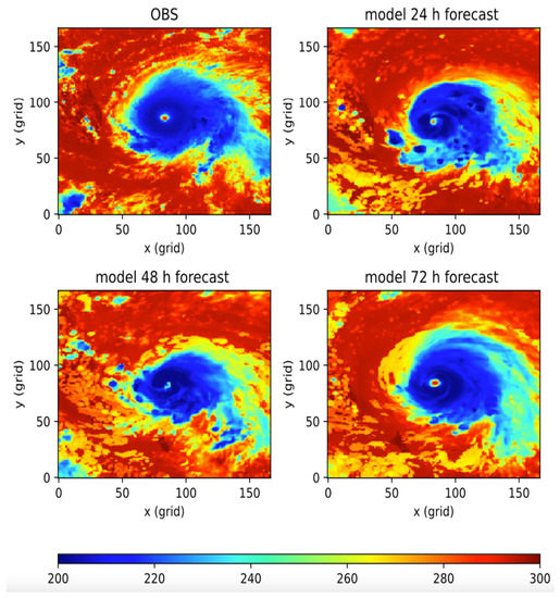 We employ a vortex-following method when we interpolate the observed and model synthetic images. The forecast TC tracks are generated by the GFDL vortex tracker [10] and include 6-hourly TC eye positions (latitude/longitude), maximum wind speed (MAX_wind), minimum sea level pressure (MSLP), and average radii of 34-, 50-, and 64-kt winds in the four quadrants of northeast (NE), southeast (SE), northwest(NW) and southwest (SW). The model synthetic images are interpolated onto 10° × 10° grids with a 0.06-degree grid spacing, with the TC centers in the center of domain grids. For the observed images, best tracks are used, which contain post-TC analyses provided by the National Hurricane Center and consist of official historical records of a storm’s 6-hourly eye positions (latitude/longitude), MAX_wind, MSLP, and average radii of 34-, 50-, and 64-kt winds in the four quadrants. The eye positions in the best tracks are used to interpolate the observed images to 10° × 10° grids with a 0.06-degree grid spacing with the TC eyes in the center. Using this vortex-following method, we avoid the impact of track errors on the evaluation, allowing us to focus on evaluating the intensity, size, and structure of the model forecast TCs. Figure 1 shows an example of the observed and model synthetic images after these images are interpolated using the above-mentioned vortex-following method. In Figure 1, the model synthetic images are taken at the same valid time as the observed but with different forecast lead times (24 h, 48 h and 72 h).