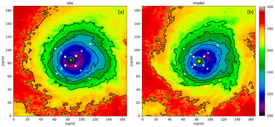 Although both the observed and the model images had similar asymmetric TC vortex structures, the coldest IR BT in the observed image is in the direction to the SE, whereas the coldest IR BT in the model image points to the NE direction.