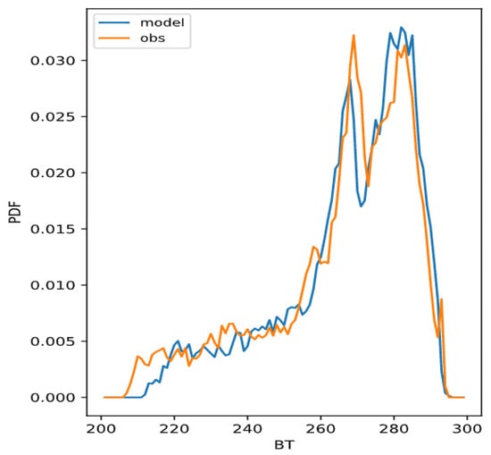Probability density function (PDF) of the observed and model forecast IR BT.