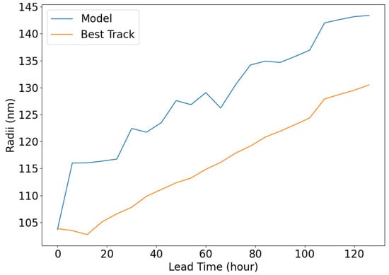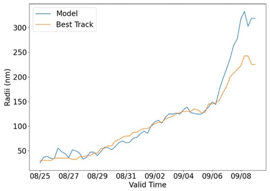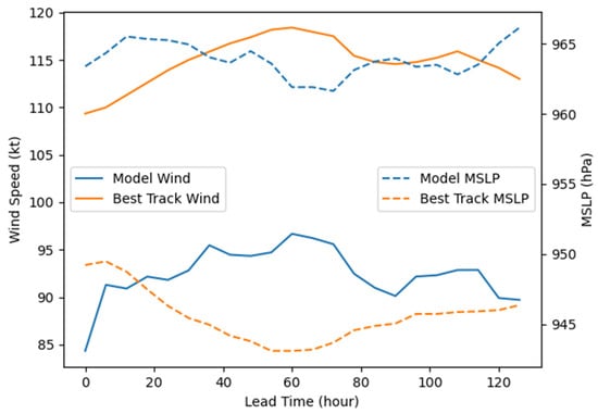 The cloud top IR BT represents radiation emitted by cloud tops into space; a lower BT indicates a higher cloud top, which indirectly indicates the strength of the convective activity and thus the intensity of TC. Therefore, the HAFS model’s prediction of less cold GOES-R IR BT—a model warm bias—suggests the model underpredicts the cloud top, and thus the TC intensity. This evaluation result is confirmed by the traditional TC intensity metrics in Figure 5, which shows that the model forecasted higher TC minimum sea level pressure and lower maximum wind speed than the best tracks. As a result, the evaluation from the GOES IR BT images are consistent with the traditional TC intensity metrics.