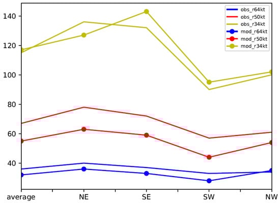 Figure 2 also depicts the similar asymmetric structures of the observed and model forecast TC vortices. The areas covered by cloud and hydrometeors in both composite observed and model images, as indicted by the IR BT contour lines (BT < 280 K), extended more toward and even beyond the domain boundaries in the NE and SE directions, whereas large cloud-free areas (BT > 280 K) are exposed in the NW and SW directions. The same asymmetric structure can be quantified in Figure 10, which demonstrates that for all thresholds, the NE quadrant always contains the most pixels while the SW quadrant contains the fewest, with the SE and NW quadrants in between and the SE quadrant containing more than NW, highlighting the asymmetric structure of the TC vortices that extended toward NE direction with the eyes located in the SW part of the areas covered by cloud and hydrometers. The asymmetric TC vortices structure revealed by the composite observed and model synthetic images can also be confirmed by the traditional TC metrics. The radii are plotted in Figure 2 as triangle markers (34-kt radii), “+” markers (50-kt radii) and round markers (64-kt radii). These markers clearly show a spatial distribution with the largest distance from the eye in the NE direction and smallest in SW; more specifically, r_NE > r_SE > r_NW > r_SW, which is consistent with the asymmetric structure depicted in Figure 10. The distribution of radii is illustrated more quantitatively in Figure 6, which depicts the largest wind radii in the NE direction and the smallest in the SW direction, as well as the wind radii in SE and NW directions in between. The only exception is that the model predicted 34-kt wind radius is larger in SE than NE.