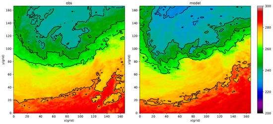Figure 2 depicts the observed and model forecast composite images of hurricane Dorian from 30 August 2019 18Z to 6 September 2019 18Z, which is its mature stage with clear rain bands around its outer edges, the eye, and circular eyewall structure. These two composite images are created by superimposing the 24 observed snapshots during this period and the corresponding forecast snapshots obtained from multiple model forecasts initialized at different times. In general, the model’s forecast vortex agrees fairly well with the observed. However, the observed composite image contains a nearly closed circular area of 1222 pixels (Table 1) with BT < 220 K, more than the model synthetic image, in which only 543 pixels, most in the eastern half of the grid, have a BT < 220 K. The observed image contains 212 pixels whose BT < 210 K, whereas the model synthetic image contains none. As indicated by the red crosses in Figure 2, the minimum observed BT is 206 K, while the model synthetic minimum BT is 211 K. The model’s warm bias is also evident in the scatter plot Figure 3 where the warm bias shifted pixels away from the blue 45° line toward the model side, particularly at the cold end of the spectrum. Similarly, one can see in Figure 4 that, while the two PDF lines match well overall, the model synthetic image accounts for a smaller fraction than the observed BT at the cold end of the BT spectrum.