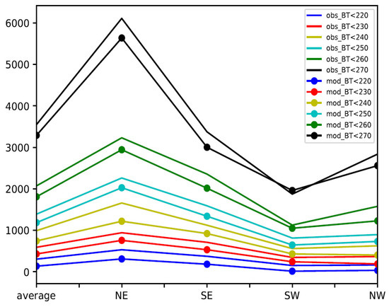 The number of pixels in the observed and model synthetic GOES-R IR BT images that are less than the certain thresholds (220 K, 230 K, 240 K, 250 K, 260 K and 270 K) in the 4 quadrants of NE SE SW and NW and the direction-averaged number.