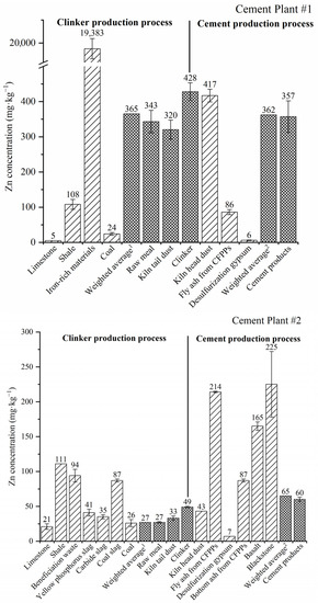 For most raw/alternative materials (limestone, yellow phosphorus slag, carbide slag) and coal, the concentration of Zn was relatively low (<50 mg·kg−1), while raw materials like shale, beneficiation waste and coal slag contained slightly higher concentrations of 90–110 mg·kg−1 (Figure 1 and Table A1). Astonishingly, iron-rich materials from the nonferrous smelting slags had the highest Zn concentration of 19,383 mg·kg−1 or 1.9 wt%, which was 2–3 orders magnitude higher than for the other raw materials. The weighted Zn concentration in different CP#1 and CP#2 raw materials was 365 and 27 mg·kg−1, respectively.