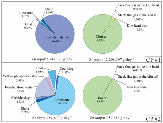 Figure 2 shows that the iron-rich materials in CP#1, which contained ultra-high Zn content (19,000 mg·kg−1), completely dominated (96.6%) the input volume of Zn, although they only accounted for 1.8% of the total material mass (Table A3). In CP#2, where all raw materials had low Zn concentrations (<120 mg·kg−1), limestone was the main input of Zn and accounted for 66% of the total inputs. Clinker represented almost all (97.5–99.7%) of the Zn outputs from these two CPs. Additionally, the daily Zn inputs and outputs of Zn during the clinker production process were roughly equal at the two CPs (Figure 2 and Figure 3), indicating that almost all Zn inputs from raw materials and fuels ended up in the clinker or were maintained in a dynamic equilibrium of inputs and outputs. While the Zn inputs for CP#1 were 10 times higher than for CP#2, low Zn emission levels (0.002%) in flue gases were observed for both CPs, suggesting that there was minimal atmospheric release.