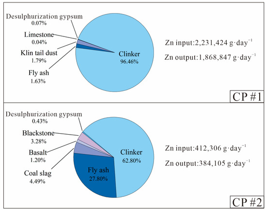 The detailed input and output flow of Zn during the whole production process in each CP are shown in Figure 4. Almost all of the Zn inputs from different raw materials (2731 kg·d−1 for CP#1; 238 kg·d−1 for CP#2) and coal (17 kg·d−1 for both CPs) ended up in the clinker (2231 kg·d−1 for CP#1; 259 kg·day−1 for CP#2), some of which was then was incorporated in the cement products (1868 kg·d−1 for CP#1; 384 kg·d−1 for CP#2; Figure 4). The mass balance of Zn, represented by the output/input ratios, during clinker production and clinker-to-cement production was 91% and 87% on average for the two CPs (Figure 2, Figure 3 and Figure 4), respectively. The slight difference was a result of fluctuation in the Zn concentrations of solid samples and the relatively small dataset.