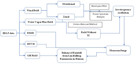 It is well known that the South China Sea-Western North Pacific region has significant intra-seasonal oscillations of 30–60 days [,] and low-frequency oscillations of about 20 days [], which are directly related to global atmospheric and oceanic changes, such as the East Asian summer wind and ENSO [,]. Many studies have pointed out that the development of tropical cyclones is closely related to the low-frequency oscillations in the atmosphere [,]. However, few studies have combined low-frequency oscillations with monsoon surges to explore the connection with the intensely enhanced rainfall of Rammasun.