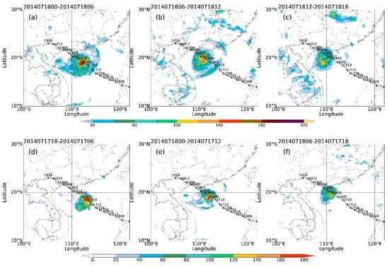The 6 h accumulated precipitation (shading, unit: mm) and tracks of Rammasun (a) from 00 UTC to 06 UTC 18 July, (b) from 06 UTC to 12 UTC 18 July, and (c) from 12 UTC to 18 UTC 18 July; this is the same as (a–c) but for rainfall difference (shading, unit: mm) of Rammasun (d) between the precipitation from 18 UTC 17 July to 00 UTC 18 July and that from 06 UTC to 12 UTC 17 July, (e) between the precipitation from 00 UTC to 06 UTC 18 July and that from 12 UTC to 18 UTC 17 July, and (f) between the precipitation from 06 UTC to 12 UTC 18 July and that from 18 UTC 18 July to 00 UTC 19 July.