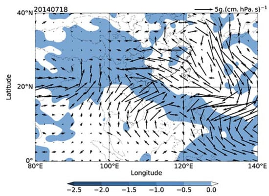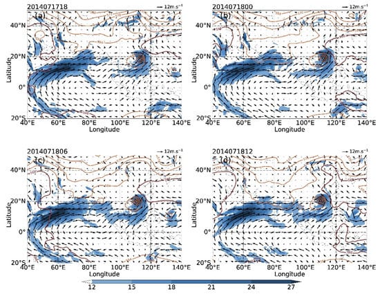 In 2014, Rammasun formed on 12 July about 210 km west of Guam. Then, it moved northwestward as a severe tropical storm and landed in the Philippines on 15 July as a severe typhoon. After that, Rammasun quickly gained strength and became a super typhoon on 18 July and then made landfall again in Hainan Island, China. With its movement, Rammasun struck Guangdong and Guangxi Province subsequently []. During Rammasun’s landfall in Hainan, the intra-seasonal oscillation of monsoons reached an extremely active phase and was closely related to the significantly enhanced monsoon surge, which suggests that the monsoon surge might have had a positive relationship with the enhanced rainfall of Rammasun. There have been many studies on the reasons for the sudden intensification of Rammasun in the South China Sea and the heavy rainfall brought to Hainan. Throughout all the studies, more consideration has been given to the high and low altitude situation, vertical wind distribution, water vapor transport and typhoon structure, while less detailed research has been completed on the EASM surge [,].