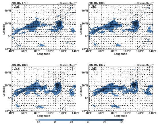 From 00 UTC to 06 UTC on 18 July, a complete water vapor transport belt initially formed from the Arabian Sea to the South China Sea under the influence of the combination of two cross-equatorial air currents. Water vapor, transported along with its circulation to the northeastern side of Hainan Island, where the precipitation increase hit the maximum, was injected into Rammasun. Thus, a rainfall enhancement was produced in this area (Figure 4c,d), and the water vapor was supplemented to compensate for the energy attenuation as well [], which played an important role in the occurrence of heavy rainfall.