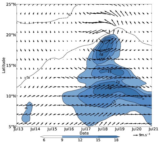 Time-latitude cross section of 850 hPa zonal wind vectors on 111° E from 13 July to 21 July (units: m s−1; the shading shows the zonal wind greater than or equal to 6 m s−1).