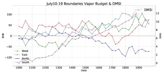 The DMSI, as defined in Section 2, represents the intensity of a monsoon during the movement of a typhoon. To figure out the water vapor budgets on different orientations of Rammasun, the BWVB has also been introduced in Section 2, which reveals the water vapor budgets of four boundaries of Rammasun during its lifetime.