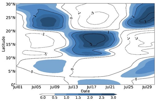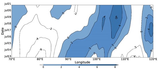 The south wind to the south of a TC turns to the southeast, injecting into the circulation of Rammasun. If the flow carries a large amount of heat, momentum, and water vapor from the tropical ocean, a favorable condition for typhoon development will be provided on the south boundary. The cross-equatorial airflow around 100° E showed a significant eastward propagation process (Figure 7). On 18 July, the positive meridional wind anomaly increased. Around 108° E, there was a cross-equatorial airflow which was enhanced to more than 5 m/s. This further developed the southwest monsoon to the south boundary of Rammasun, contributing to the increasing BWVB and intensity of the monsoon. The enhancement of zonal and meridional winds can be summarized as the enhancement of the southeast monsoon. There will be a dramatic increase in precipitation in the TC making landfall when the strongest northward propagation of the EASM surge occurs [].