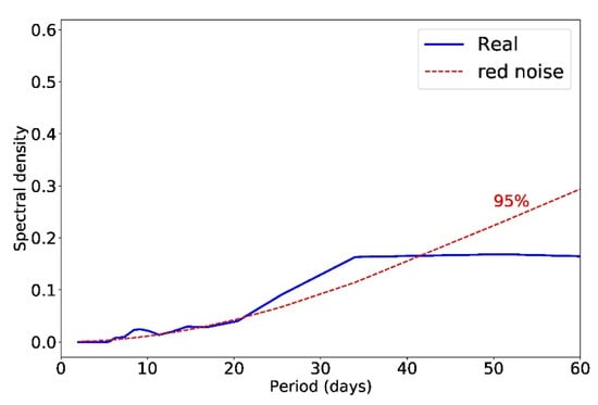 Power spectrum analysis of smoothed zonal wind on 850 hPa in the northern South China Sea (105~115° E, 12~20° N) during May–September 2014 (the red dotted line indicates 95% confidence).