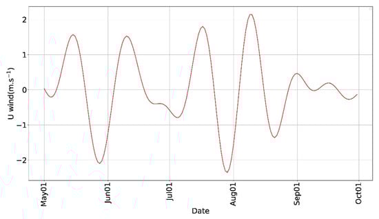 The different phases of intraseasonal oscillations have different effects on the monsoon surge. Since the area, 105~115° E, 12~20° N, in the northern South China Sea is located to the southwest of the landfalling typhoon and the path of the southwest monsoon, the zonal wind in this area can represent the southeast monsoon and will inject into the circulation of Rammasun, exhibiting a positive relationship with the intensity of Rammasun. Thus, in this study, the power spectrum analysis was applied to the 850 hPa mean zonal wind in the area to study the lower tropospheric zonal wind in the northern South China Sea from May to September 2014. The 850 hPa wind in the summer of 2014 was mainly dominated by a 20–40 days low-frequency oscillation (Figure 8). Band-pass filtering of the average zonal wind in this area (Figure 9) has shown that the low-level zonal wind of EASM on the 850 hPa level had a low-frequency oscillation with a period of 20–40 days. The peak period (17–18 July) refers to an extremely active phase of the low-frequency oscillation at the time of the heaviest rainfall in Hainan. This result indicates that the low-frequency oscillation definitely played an important role in the heavy rainfall during the landfall of Rammasun.