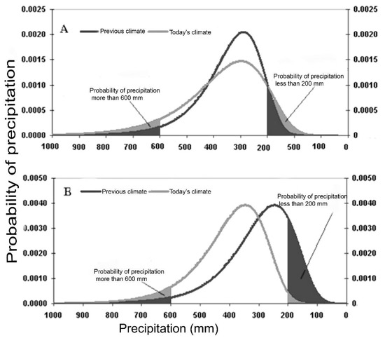 In the calculation of Gumbel distribution, the area under the distribution curve equals to 1 unit or 100%; as the increase in the arithmetic mean for precipitation causes accompanied changes in potential density of precipitation, especially the extreme ones. This change is clear when compared with previous time-periods (Figure 2A). Figure 2A shows the changes in the precipitation averages in a hypothetical station during two periods. The figure reveals an increase in the flattening of the grey curve that represents today’s climate (the most recent time-period). Such flattening caused an increase in the scattering of the precipitation and an increase in its standard deviation from the averages, which means an increase in the probability of extremely low rains occurrence, which is equal to 200 mm in Figure 2A. Moreover, the increase in the probability that precipitation reaches amounts more than 600 mm as compared to the amounts in previous time-period can also be calculated. Figure 2B shows an increase in precipitation average where the probabilities of extremely high rain has increased and at the same time the probabilities of extremely low precipitation has decreased. The current research will focus on extremely high or low precipitation averages which constitutes either more than or less than 10% of the total annual rainfall [39] during the period from 1970–2000, and at the same time to observe the probabilities of rainfall change in second time-period from 2001–2010.