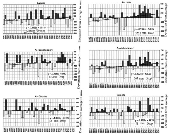 Generally speaking, a decrease in the annual precipitation regression line during the first period 1970–2010 for the six meteorological stations is observed. Figure 3 shows a moderate decrease in annual precipitation amounts from the beginning of the first period (1970), which reached 125 mm in Latakia station, 175 mm in Al- Basel airport, 52 mm in al- Qirdaha, 75 mm in Salanfa. The highest and riveting decline occurred in Al-Hafa and Qastal al-Ma’af stations, with an annual decline rate of 325 mm and 263 mm, respectively.