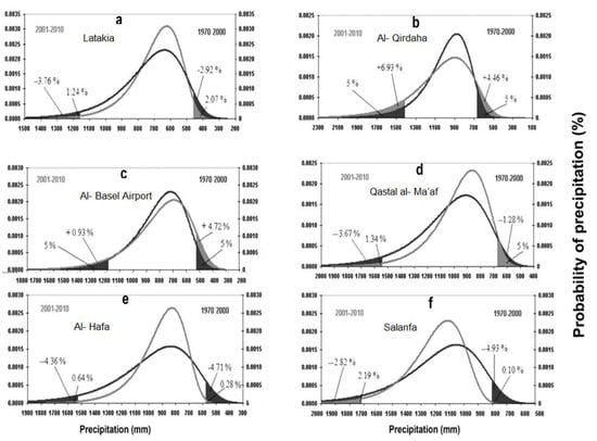 Changes in the potential probability of the annual precipitation average during both time-periods. (a) Latakia; (b) Al- Qirdaha; (c) Al- Basel airport; (d) Qastal al-Ma’af; (e) Al- Hafa; (f) Salanfa.