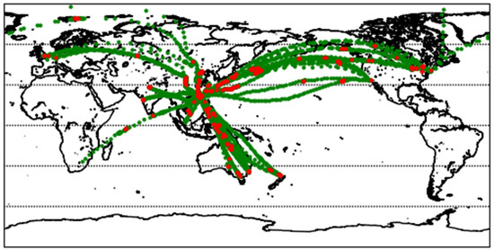 Spatial distribution of the flight data used in the comparison. Green dots are for flight datapoints with estimated EDR < 0.2 by the NCAR Algorithm, whereas red dots are for those with estimated EDR ≥ 0.2.