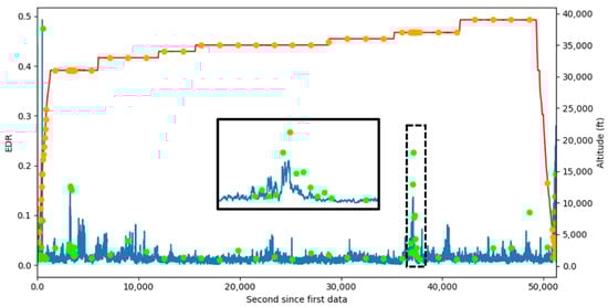 An example time series of the EDR estimates from the two algorithms. Data from the NCAR Algorithm is shown in dots, whereas the data from the NLR Algorithm is shown in lines. EDR estimates are in lime and blue. The altitude of the data from the two data sources (red and orange) are also shown in the figure to validate a correct matching between the two data sources. The insert shows the magnification of the data inside the dashed black rectangle.