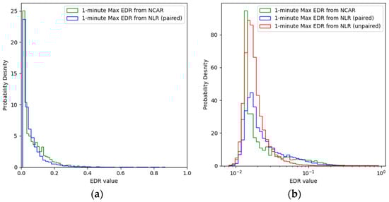 The frequency distribution of the EDR data computed from the two algorithms. (a) The frequency distribution over the full range of EDR. (b) The same as (a), except that the horizontal axis is in log scale. The frequency distribution of all EDR estimates (without pairing with the reporting frequency of the EDR from the NCAR Algorithm) is shown in red.