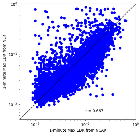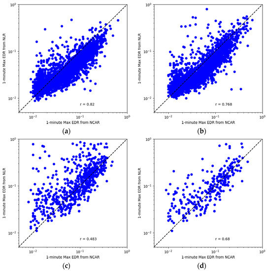 where and are the correlation and sample size of the two samples, respectively. This value was 5.10 (corresponding to a p-value of in a two-tailed test) when applied to testing the difference in the correlation shown in these two figures. However, if we limit the dataset and include only those data captured during turbulence (estimated EDR ≥0.1 from both algorithms), the corresponding z score drops to around 0.23 (corresponding to a p-value of 0.82 in a two-tailed test) because the sample size drops to almost of that of the original. The current differences in the correlation between the two algorithms mainly result from those small values of EDR estimates.
