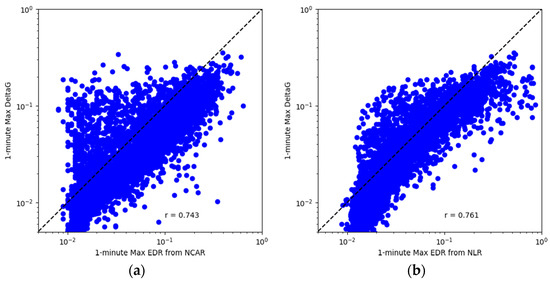 Comparisons between the NCAR EDR estimates (a) and the NLR EDR estimates (b) with RMS-g recorded in the QAR data.