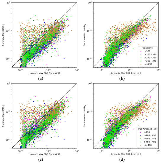 Same as Figure 6, except the data is partitioned according to: (a,b) altitude t; and (c,d) true air speed. Comparisons between the NCAR EDR estimates with RMS-g are shown on the left (a,c), whereas the comparisons between the NLR EDR estimates with RMS-g are shown on the right (b,d).