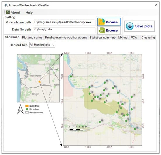The Hanford site, the largest DOE environmental cleanup site in the United States, is located in eastern Washington state, USA (Figure 1 and Figure S1). It has 32 weather stations throughout the 1500 km2 area. The Hanford meteorological monitoring network provides a range of weather forecast products, including near real-time data from well-distributed historical meteorological and climatological data through a variety of monitoring stations. Data from 23 stations at the Hanford site was evaluated for this work. The monitoring stations are marked in green circles in Figure 1. Most of the monitoring stations are above sea level at 119 m or 120 m, with a couple at higher elevations up to 322 m.
