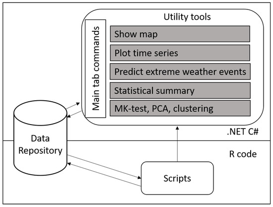 The schematic diagram of Extreme Weather Events Classifier (EWEC). EWEC contains seven major components corresponding to the seven tabs in the user interface: “Show map”, “Plot time series”, “Predict extreme weather events”, “Statistic summary”, “MK-test”, “PCA”, and “Clustering”.