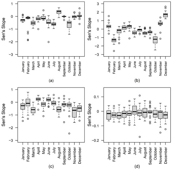 The Sen’s slope box plot of the maximum monthly temperature is shown in Figure 3a. The trend of the maximum monthly temperature has decreased over the past decade. However, the trend of maximum monthly temperature increased in August. The values of Sen’s slopes are close to 0. The result indicates that the variation of temperature in September is statistically insignificant. This result suggests that summers persist until August and that the maximum temperature is increasing. The Sen’s slope box plot of the minimum monthly temperature is depicted in Figure 3b. The monthly minimum temperature increases during winter. February and October’s minimum and maximum monthly temperatures tend to go down, which suggests that transitional seasonal high and low temperatures are lower than in previous years.
