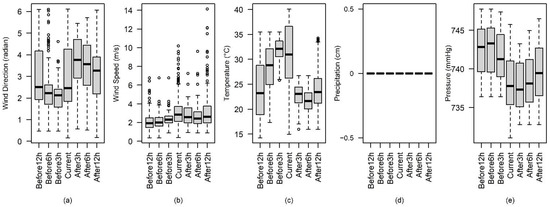 The box plots of (a) wind direction, (b) wind speed, (c) temperature, (d) precipitation, and (e) pressure using data 12-, 6-, and 3-h. before, during, and 3-, 6-, and 12-h. after the heatwave extreme events.