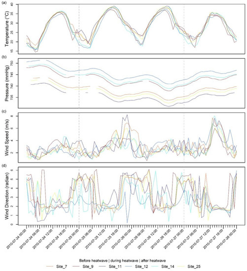 A selected time series of meteorological measurements during the heatwave episode is displayed in Figure 5. Six stations are selected to highlight the temporal change in temperature and pressure. This exercise is limited due to data availability because only 6 out of the 32 weather stations have measured the complete meteorological variables. A heatwave does not significantly impact wind speed or wind direction. The temperatures of 25 and 26 July of 2010 were higher than those before and after heatwave events. The temperature was high during the advent of heatwave events, and it remained high continuously. There was an anticorrelation between temperature and pressure. When temperatures went up (Figure 5a), pressures went down (Figure 5b). During the heatwave event, pressure was lower than before and after such an event. This finding can help us form the primary applications of weather-driven extreme events that may complicate site operation when dealing with hazard transport and dispersion. The wind speed plot (Figure 5c) shows that the wind speed is low during the heatwave period. The lower wind speed could not dissipate heat efficiently and may have been a factor for the observed prolonged heatwave events in Hanford during summers. High pressure conditions were associated with low wind speeds [58]. Figure 5d illustrate that, in general, the wind direction is high in radians at nighttime. As only three monitoring stations have complete observed parameters, it is expected that these results may not provide a full understanding of the cause and relationship of the heatwave occurrences. The key implication is that meteorological data must be fully accessible before further investigation. The approach illustrated here serves this purpose.