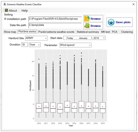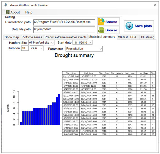 Currently, EWEC supports comma-separated value (CSV) data files, which contain data in the order of timestamp, wind direction, wind speed, temperature, precipitation, and pressure. EWEC contains seven major components corresponding to the seven tabs in the user interface. The “Show map” component is used to show the geolocations of the user-picked stations and the corresponding weather stations. The “Plot time series” component is used to plot a meteorological time series for user-selected stations, parameters, and time periods. For example, the plot of wind speed time series from 2010 to 2019 in the ARMY station is illustrated in Figure 6. The “Predict extreme weather events” component is used to detect extreme weather events for the meteorological dataset using regional specified thresholds, which can vary if moving to different regions. The “Statistic summary” component is used to provide summary information of the monitoring data, including different types of wind, drought/precipitation, temperature, and a strong variation of pressure change. The drought information, for example, when choosing 60 days as the threshold for all Hanford monitoring stations from 2010 to 2019, can be seen in Figure 7. According to the data analysis, we can conclude that 2013, 2014, and 2015 had more maximum drought periods than other years, and drought usually happened in summer. The “MK-test” component is used to analyze the trending non-stationarity of weather attributes. The “PCA” component is used to detect heatwaves and strong wind events for the selected period for the selected stations. The “Clustering” component is used to detect the similarities of each parameter for the selected period among all stations.