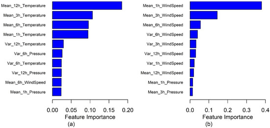 The top 10 FI plots of the heatwave model and the strong wind model are presented in Figure 8a,b, respectively. Figure 8a demonstrate that the past 12-, 6-, 3-, and 1-h. temperatures are essential indicators for heatwaves. Pressure-related parameters, such as the variation of the past 12-h. temperature and the past 6-h. pressure, also contribute to the heatwave RF model. The average temperature of the past 12 h is the dominant factor in the heatwave model, and FIs of the average 1-, 3-, and 6-h. temperature are comparable.