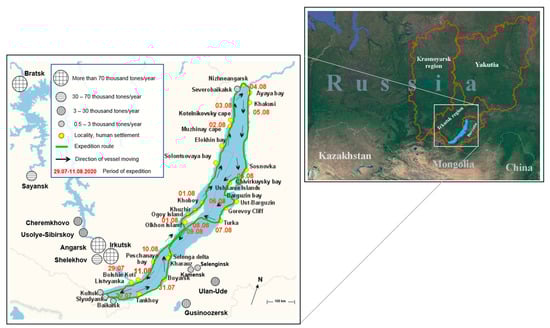 Lake Baikal is the largest reservoir of fresh water with unique flora and fauna. In 1996, Lake Baikal was declared a UNESCO World Heritage Site. Presently it is negatively affected by climate change, water warming, industrial emissions, shipping, touristic activities, and Siberian forest fires. The assessment of air pollution related to Baikal’s ecosystem damage is an unsolved problem [28,29,30,31,32,33]. In this case, the study of this article is focused on comprehensive observations of spatiotemporal distributions of the dispersed composition of aerosols and gas impurities, such as ozone, sulfur dioxide, and nitrogen oxides during the purposely designed expedition over Lake Baikal in the summer of 2020.