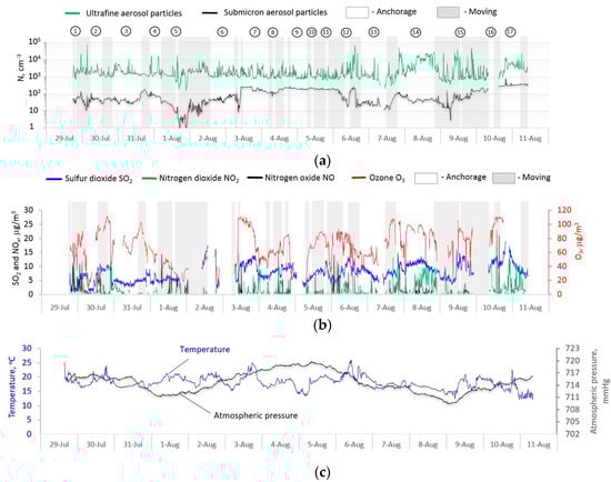 The ultrafine particle number concentration in the size range from 5 to 200 nm (UFA) and the submicron aerosol in the size range from 0.3 to 10 microns (SMA), concentrations of ozone, sulfur dioxide, and nitrogen oxides, and meteorological parameters (temperature and pressure) were averaged over a 10-min measurement interval along the entire route of the vessel, as shown in Figure 2.