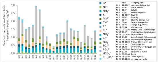 Along the entire route, aerosol samples (23 samples) were taken using a high-volume sampler PM10 of Andersen Instruments Inc. (45002, Cleves, OH, USA) on Watman-41 filters measuring 203 × 254 mm with a pumping speed of 17 L/min, which were subsequently analyzed for various pollutants by ion and high-performance liquid and gas chromatography, inductively coupled plasma mass spectrometry in an Accredited Laboratory (No. ROSS RU. 0001.513855) of Limnological Institute SB RAS [39]. The laboratory complies with the requirements of International Organization for Standardization (ISO/IEC 17025-2019), as well as ISO 9001:2015 “Quality management systems—Requirements”. Samples of aerosol admixtures for chemical analysis were collected on filter packs with the use of the filterpack method, adopted in international monitoring networks [40]. The ionic composition of the aerosols was determined from the soluble fraction. The sampled matter was extracted from the filters with the available volume of deionized water (0.15–0.20 μS). A portion of the obtained solution was retained for pH measurements. The remainder of the solution was filtered through an acetate-cellulose filter with a 0.2-µm pore size. Ions of NH4+, Na+, K+, magnesium (Mg2+), and Ca2+ as well as SO42−, NO3−, hydrocarbonate (HCO3−), and chloride (Cl−) ions were determined from the filtrate. Atomic adsorption and ionic chromatography were used to determine the chemical composition of the soluble fraction. These techniques are recommended to provide correlation with data obtained in other areas of the world [40,41]. An atomic adsorption spectrometer (Carl Zeiss Jena, Jena, Germany), high performance fluid chromatographer (Milichrome A-02, Novosibirsk, Russia), and ionic chromatographer ICS-3000 (Sunnyvale, California 94088-3603, Dionex, USA) were employed. The introduction of ion determination through the ion chromatography method made it possible to obtain the measurement results with a confidence level of P = 0.95 accurately to within 4%. We note that the reliability of chemical analysis results, obtained with these methods and instruments, was repeatedly confirmed through participation of laboratory of Limnological Institute SB RAS in data quality control (QA/QC) as part of international programs [42,43,44]. The obtained data deviated from true values by no more than 10–15%, indicating the high quality of personnel and reliability of the results. The quality of the analyses was approved by inter-laboratory comparative experiments performed within the framework of international programs Global Atmosphere Watch [45] under the aegis of the World Meteorological Organization (WMO) and Acid Deposition Monitoring Network in East Asia (EANET). The sample collections were performed at anchorage and moving of the vessel from 6 h to 24 h during the expedition period. For the sampling, the proper precautionary measures were taken in order to prevent possible contamination from potential sources such as the ship exhaust and lake water droplets.