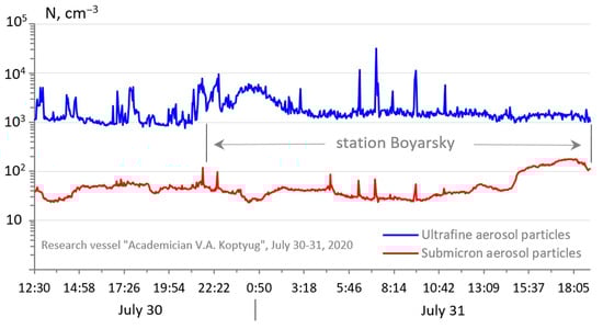 Temporal variation of the concentration of ultrafine atmospheric particles (upper curve) and submicron particles (lower curve) in the driving layer of Lake Baikal, 30–31 July 2020.