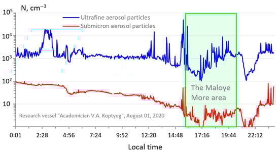 In general, there are both extended areas up to 100–200 km with an elevated concentration of gas impurities, ultrafine and submicron atmospheric particles, as well as individual local bursts depending on the distribution of emissions, circulation features, and photochemical processes, and, in general, on weather conditions in a particular area. The average values for the measurement period of the ultrafine and submicron particles number concentration in the Baikal water area were, respectively, 2986 particles/cm3 and 98 particles/cm3.