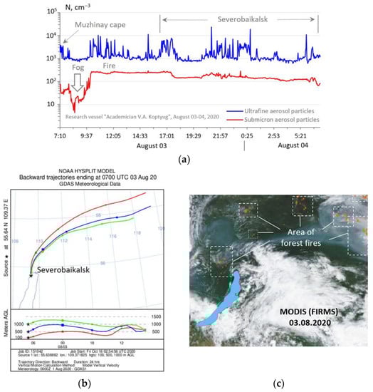 Temporal variation of concentration of aerosol particles in the driving layer of Lake Baikal during fog and smoke emission in the period of 3–4 August 2020 (a); reverse trajectories of movement of air masses according to the HYSPLIT model (b); and map of wildfires according to MODIS satellite data (c).