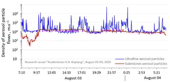 Temporal variability of density of aerosol particle flows on the surface of Middle Baikal, 3–4 August 2020.