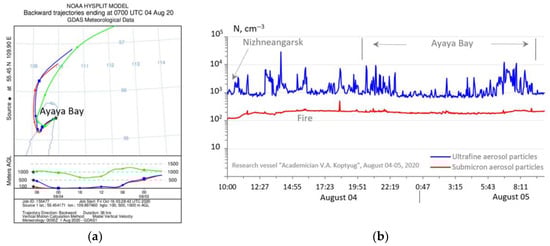 Backward trajectories of the movement of air masses according to the HYSPLIT model (a); the time course of the concentration of ultrafine and submicron aerosol in the near-water of Lake Baikal in the period 4–5 August 2020 (b).