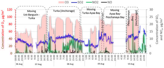Upon arrival of the vessel “V.A. Koptyug” to the settlement Turka, one of the largest ports on the eastern coast of Lake Baikal, the concentration of nitrogen oxides increased sharply up to 10–12 μg m−3) and sulfur dioxide up to 12–14 μg m−3 (Figure 10).