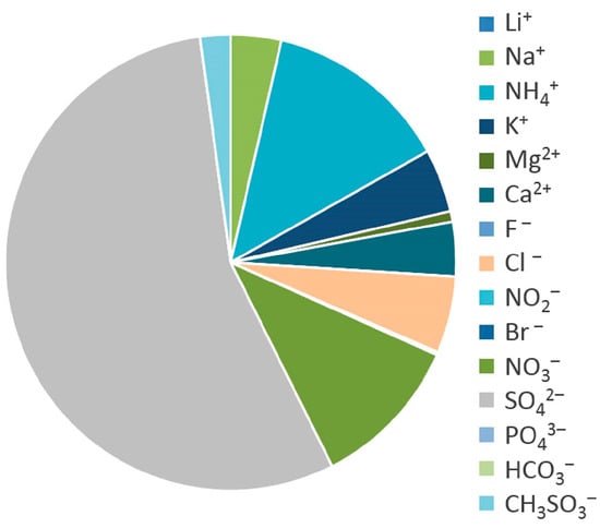 The chemical composition of aerosol in the atmosphere of Turka shows its strong dependence on local sources of aerosols. The aerosol samples were dominated by sulfate ions (1.08 μg m−3), whose share was 55% of the total amount of ions, with nitrate ions (11%) and ammonium cations (13%) (Figure 11).
