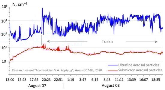 Temporal variation of the concentration of ultrafine and submicron aerosol in the near-water layer of Lake Baikal in the period 7–8 August 2020 (Turka settlement).