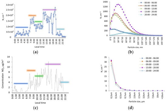 The main contribution to the concentration was made by particles from 5 to 80 nm. In the morning and afternoon hours, the concentration of an aerosol with a size of d < 80 nm dominated (Figure 13b) relative to concentrations at night and evening hours, since the formation of nanoparticles in the troposphere is closely related to solar activity initiating photochemical transformations in the atmosphere. Morning and midday peaks of the concentration of particles could be associated with morning primary emissions from human activity and ozone photochemistry peak later, just as well as NO2 correlation. The strongest relationship between the particle number concentration of ultrafine aerosol was manifested with the concentration of nitrogen dioxide NO2; the correlation coefficient was 0.61.