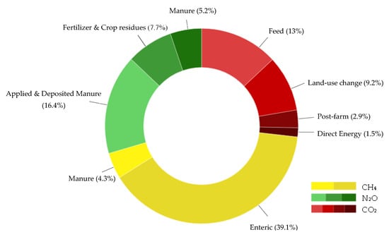 Livestock is a substantial contributor to global GHGs, with emissions estimated at 8.1 gigatons of CO2-eq per annum or 14.5% of total anthropogenic emissions [7]. The three main GHGs emitted by livestock are methane (CH4), nitrous oxide (N2O), and carbon dioxide (CO2). Their relative incidence has been explored using the FAO Global Livestock Environmental Assessment Model (GLEAM) [102] and are converted to CO2 equivalents using 100-year global warming potentials from IPCC (2014) (298 for N2O and 34 for CH4).