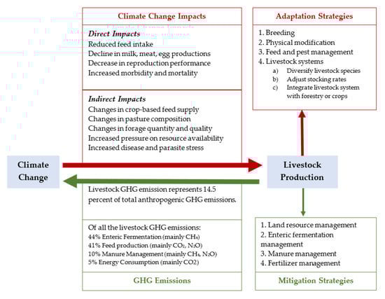 The interaction between ongoing climate change and demands for increasing livestock production makes it challenging to increase production while lowering climate impacts and Greenhouse Gas (GHG) emissions. Addressing such challenges requires an understanding of climate change effects on livestock production, as well as the effect of both adaptation and mitigation actions. This paper overviews climate change impacts on livestock production, livestock emissions, and possible adaptation and mitigation actions. In constructing this review, we relied on material from 157 references, with the papers classified as shown in Table 1.